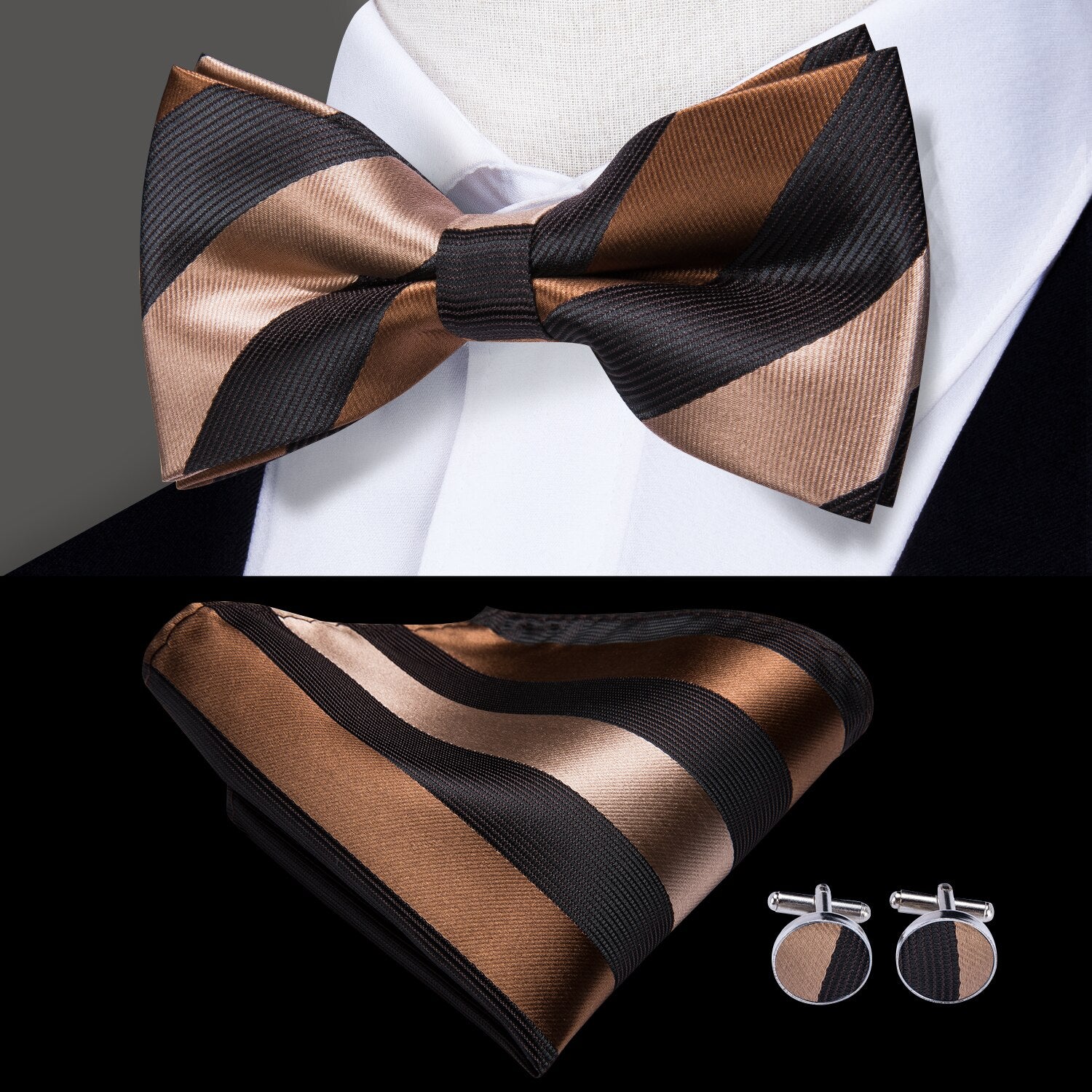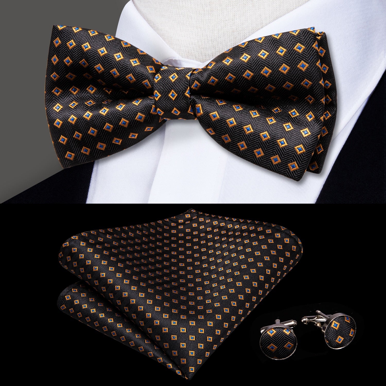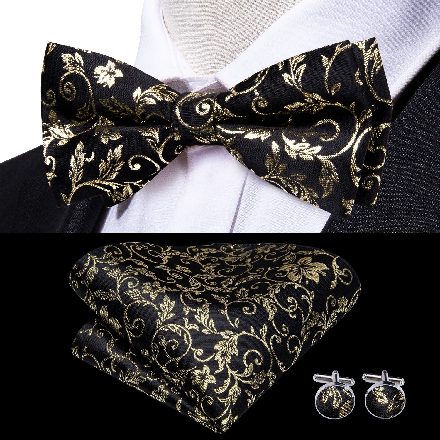 Hi-Tie Classic Black Bow Ties for Men 100% Silk Butterfly Pre-Tied Bow Tie Pocket Square Cufflinks Suit Set Floral Gold Bowties